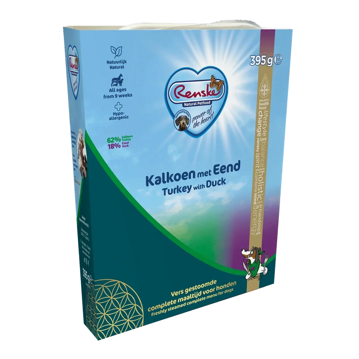 80% Vers Gestoomde kalkoen en eend Renske Vers Gestoomde Vlees Maaltijd met kalkoen en eend is een vlees maaltijd voor jonge en volwassen honden van alle rassen vanaf 9 weken. Het product bevat minimaal 80% vers gestoomde kalkoen en eend en is aangevuld met wat bruine rijst, duurzaam geteelde moestuin groenten en kruiden.