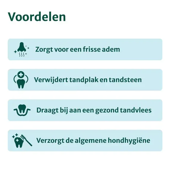 Let op: Dental Bright is een natuurlijk supplement als aanvulling op de dagelijkse mondhygiëne voor een frisse adem en gezond gebit, maar vervangt geen medisch advies van een dierenarts of tandarts.