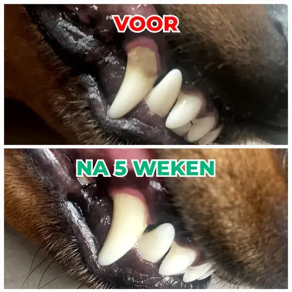 De meeste hondenbaasjes merken binnen 3 tot 6 weken positieve veranderingen, zoals een frissere adem, een schoner gebit, wittere tanden en een gezondere mond. Dit hangt af van verschillende factoren; de tijd kan variëren afhankelijk van de mondgezondheid van je hond.