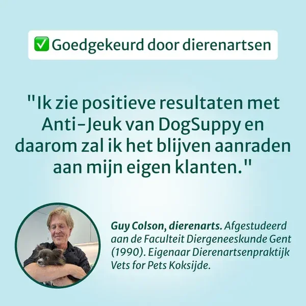 Onze Anti-Jeuk formule werd ontwikkeld door ervaren nutritionisten. Dankzij de combinatie van Probiotica, Prebiotica, Parabiotica en Postbiotica krijgt de darmgezondheid van je hond de nodige ondersteuning. Daarnaast bevat het een krachtige mix van natuurlijke grondstoffen en antioxidanten zoals Quercetine en Colostrum, die de gevoeligheid van de huid verminderen.