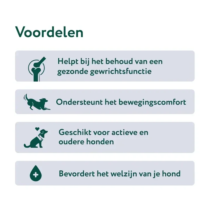 Samen helpen deze ingrediënten om je hond soepel en comfortabel te laten bewegen – elke dag opnieuw.