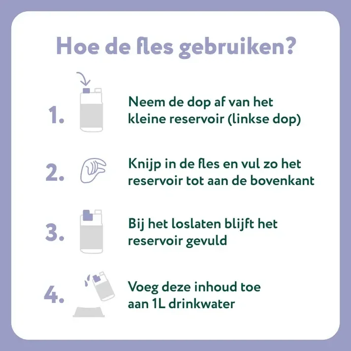 Met behulp van het doseerdopje kan je de dosering van 12 ml bekomen. Voeg dit vervolgens toe aan 1 liter drinkwater.