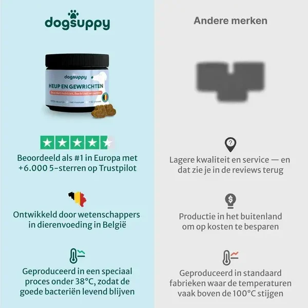 De ingrediënten in DogSuppy-producten zijn hoog gedoseerd, wat bijdraagt aan een effectieve ondersteuning. Houd er rekening mee dat de natuurlijke grondstoffen intern werken, dus het kan enige tijd duren voordat veranderingen zichtbaar worden. De meeste hondenbaasjes merken binnen 6 tot 8 weken positieve veranderingen in de gewrichtsgezondheid van hun hond.