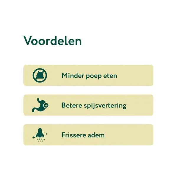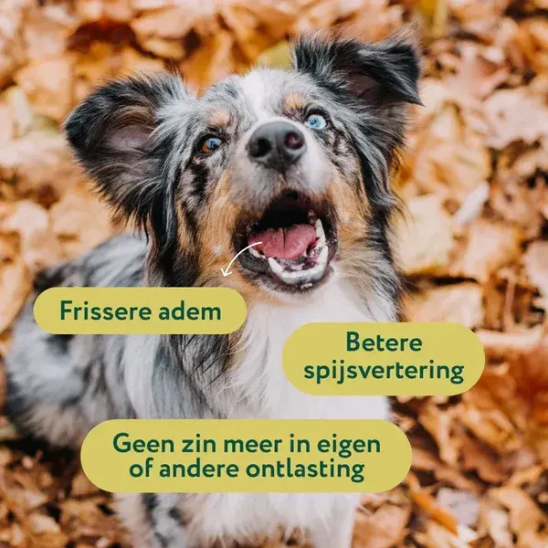 Samen zorgen deze ingrediënten voor een effectieve, natuurlijke aanpak: ze maken de ontlasting minder aantrekkelijk, verbeteren de spijsvertering én ondersteunen de algemene gezondheid van je hond.