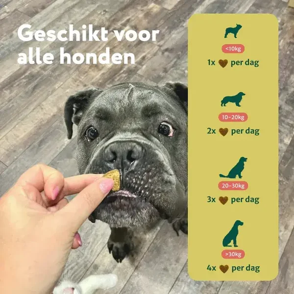 - Vanaf 30 kg: 4 snoepjes per dag