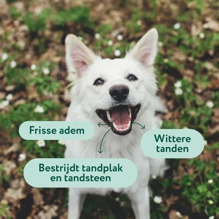 Dental Bright bevat bruine algen en pre- en probiotica. Deze ondersteunen een gezonde speekselproductie en bevorderen een evenwichtige bacteriebalans in de mond van je hond. Het speeksel helpt bij het behouden van een schoon gebit. Daarnaast bevat het natuurlijke ingrediënten zoals pepermunt en granaatappel, die bijdragen aan een frisse adem.