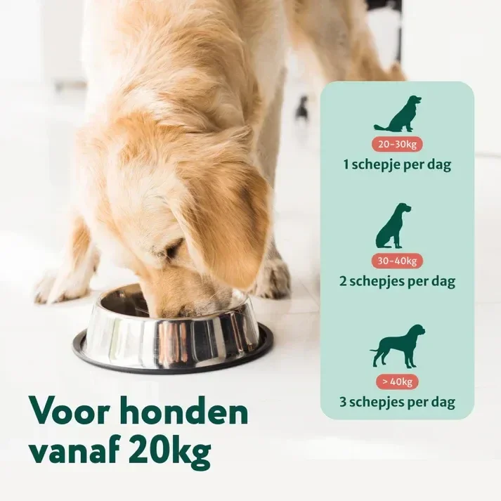 Simpel! Schep het poeder over het voer van je hond. Het correcte maatschepje wordt meegeleverd met de pot.