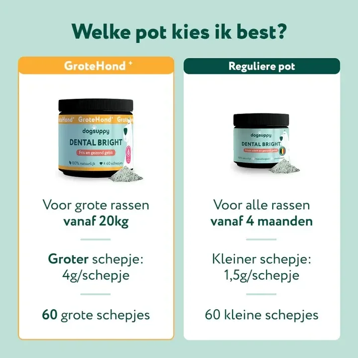 Let op: Dental Bright is een natuurlijk supplement als aanvulling op de dagelijkse mondhygiëne voor een frisse adem en gezond gebit, maar vervangt geen medisch advies van een dierenarts of tandarts.