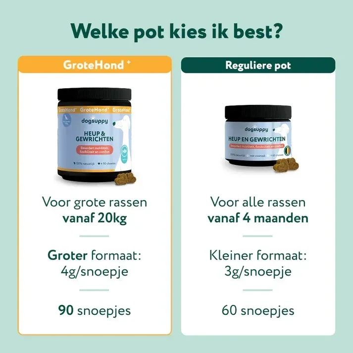 - <20 kg : shop onze reguliere potten Heup & Gewrichten op maat van honden < 20 kg