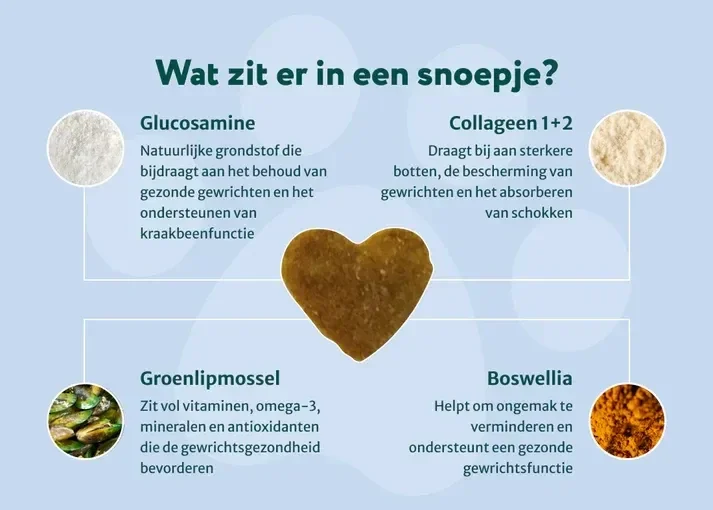 Een belangrijke stof die werkt als smeermiddel en schokdemper in de gewrichten van je hond. Het helpt bij het verminderen van slijtage en het soepeler maken van bewegingen. Daarnaast heeft het ontstekingsremmende eigenschappen die helpen bij het verminderen van ontstekingen en ongemak bij gewrichtsproblemen.