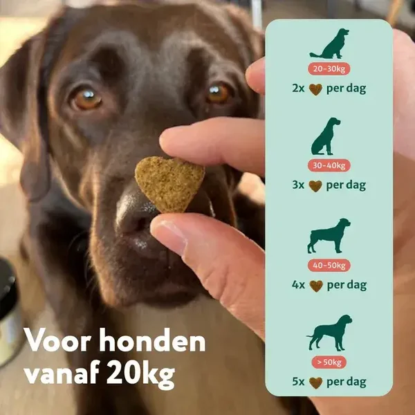 Onze formules zijn berekend op basis van het gewicht van je hond. Voor optimale resultaten, geef één snoepje per 10 kg lichaamsgewicht. Dit betekent: