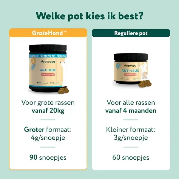 - Minder dan 20kg: shop onze reguliere potten Anti-Jeuk voor honden van minder dan 20 kg