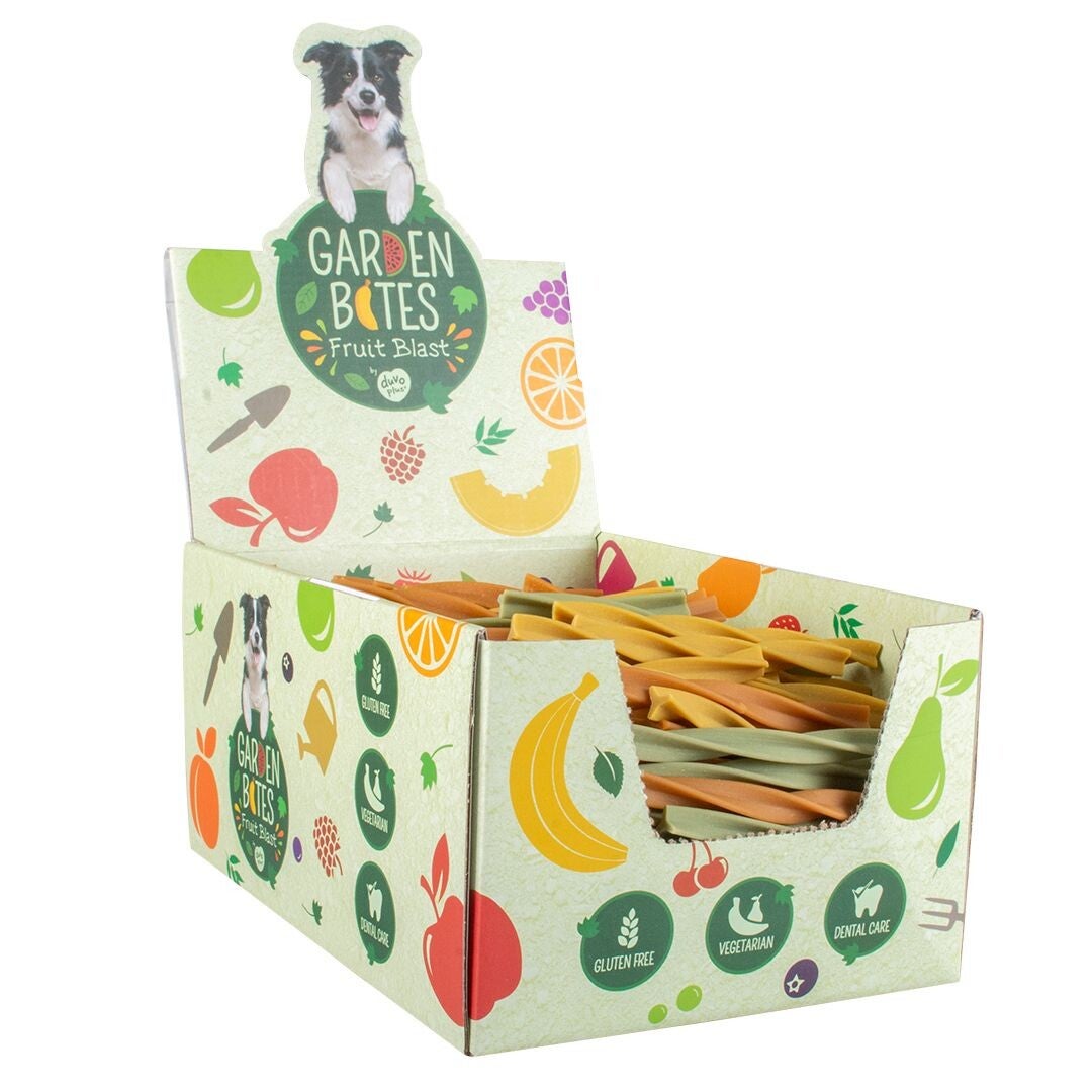 De vegetarische Garden Bites van duvoplus zijn een ideale beloning of tussendoortje voor je hond. In de Garden Bites zit maar liefst 55% zoete aardappel. Zoete aardappelen zijn een geweldige aanvulling op het dieet van je hond, ze zijn rijk aan oa. vitamines, calcium en ijzer. Deze "Fruit Blast" versie is verrijkt met heerlijke banaan, perzik & peer, dit zorgt voor een echte fruitsensatie voor je hond. Door de speciale vorm wordt spelenderwijs het tandvlees gemasseerd en de tanden gereinigd. Het natuurlijke muntextract zorgt bovendien voor een frisse adem. De snacks zijn 100% glutenvrij waardoor ze licht verteerbaar zijn en zeer geschikt zijn voor honden met allergieën. De leuke vormen maken deze snacks compleet onweerstaanbaar!