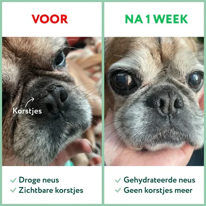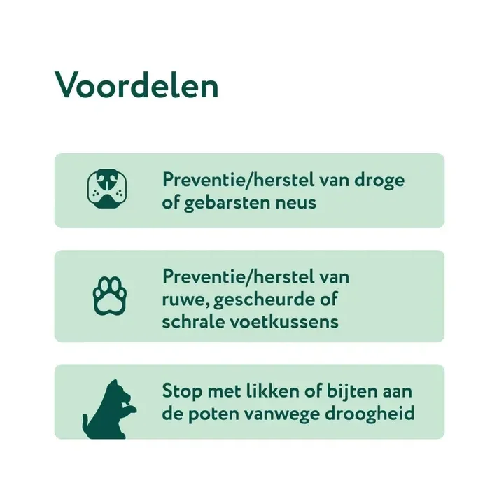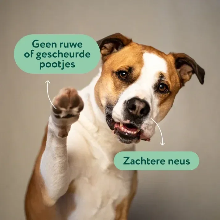 De neus en pootkussens van je hond staan dagelijks bloot aan invloeden van buitenaf: kou, hitte, strooizout en ruwe ondergrond. Dit kan leiden tot uitdroging, kloven of overmatige eeltvorming. Sommige honden hebben daarnaast van nature een gevoelige huid.