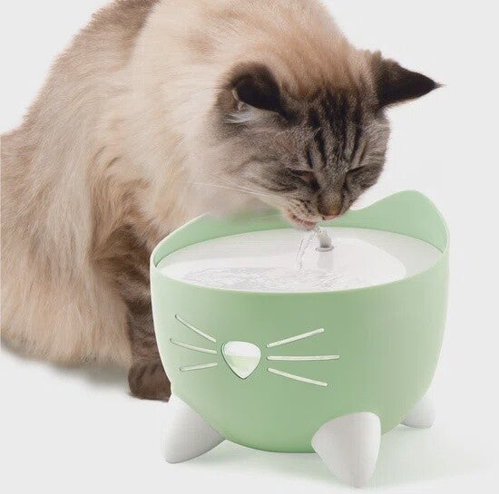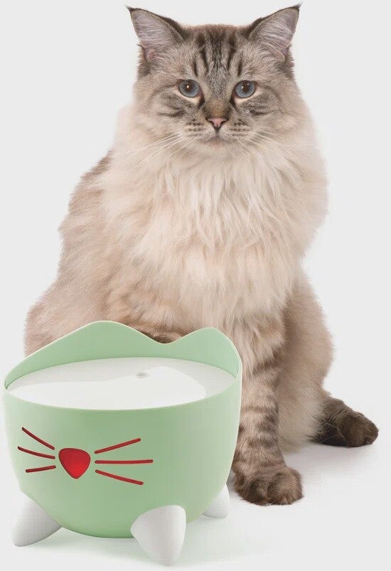 De Cat It Pixi drinkfontein – Groen zorgt voor een doorlopende stroom van fris water. Het lopende water moedigt de kat aan om meer te drinken wat de kans op urine problemen vermindert. Het neusje op de fontein geeft aan of er genoeg water is. Doordat de fontein het water in een boogje spuit kan de kat op een natuurlijke manier drinken zonder te buigen. De pomp is extreem stil, doordat deze in het reservoir zit. Het filter verwijdert viezigheid en vieze geurtjes, je kan het filter vervangen (los verkrijgbaar).