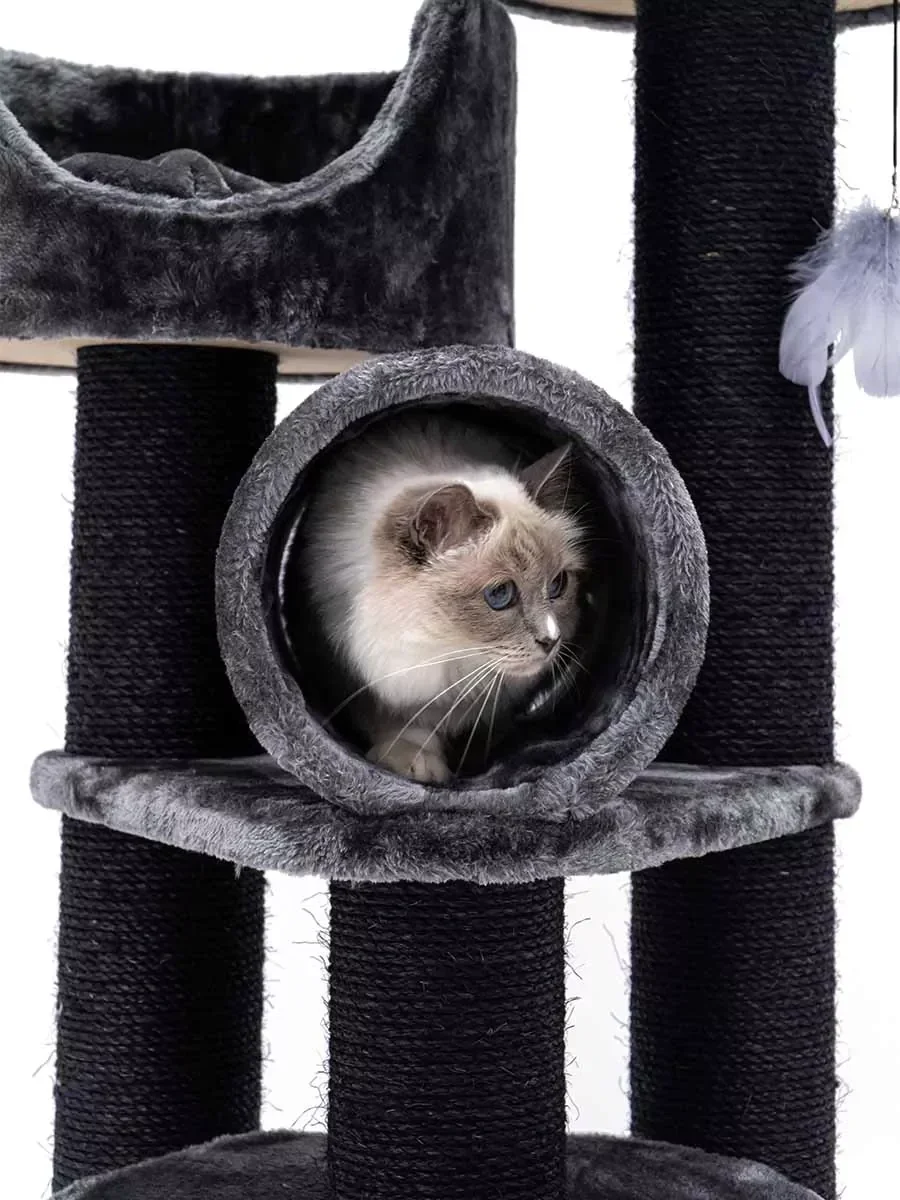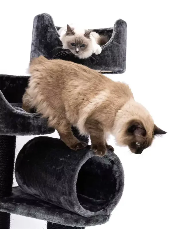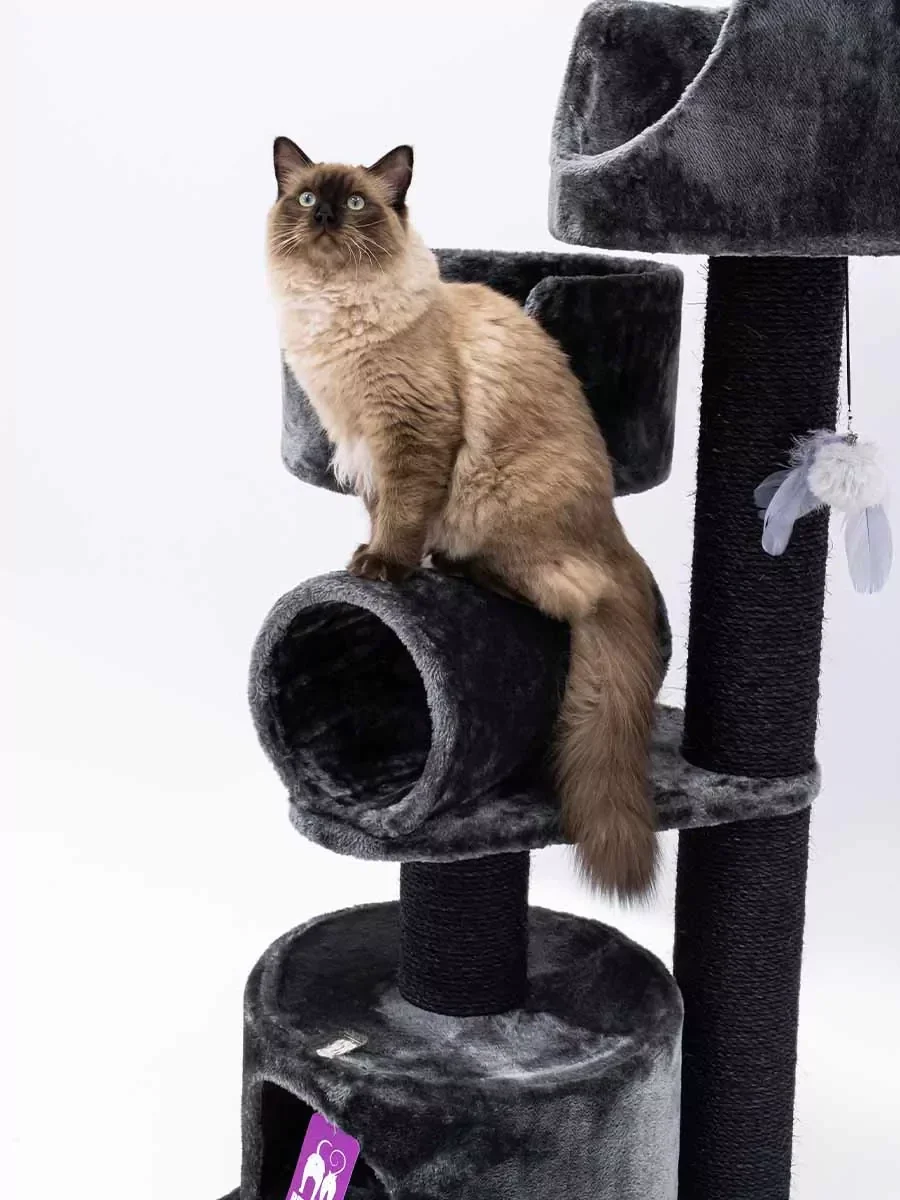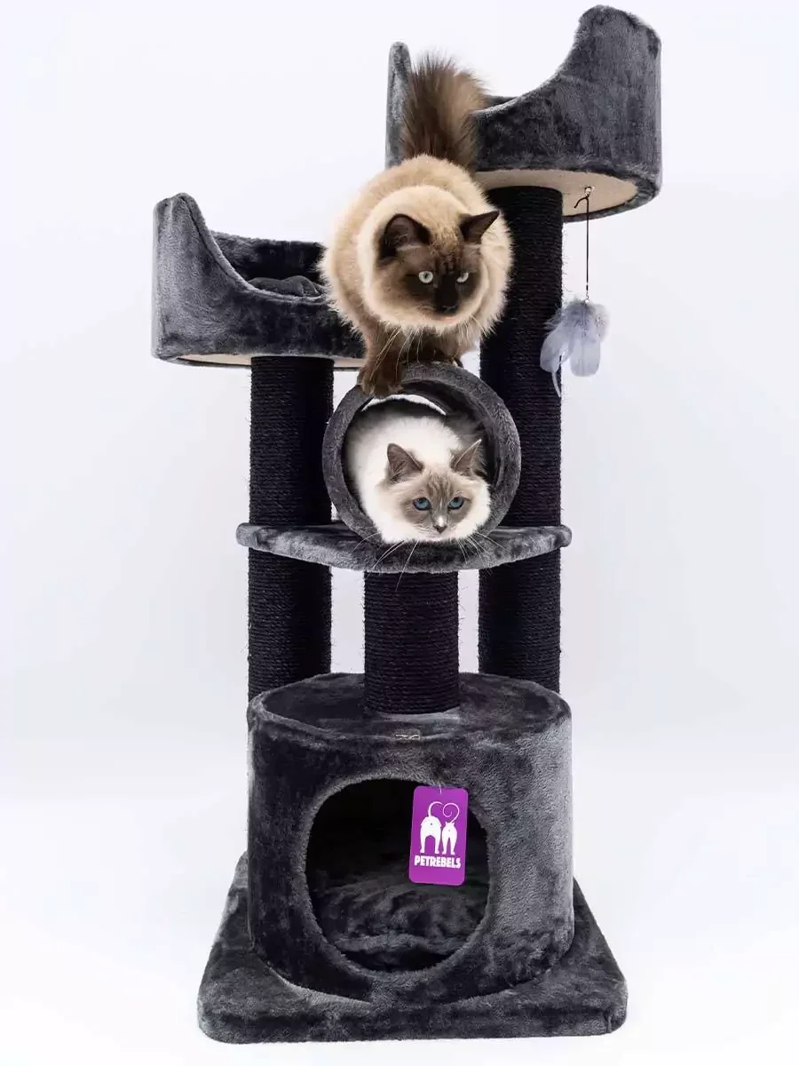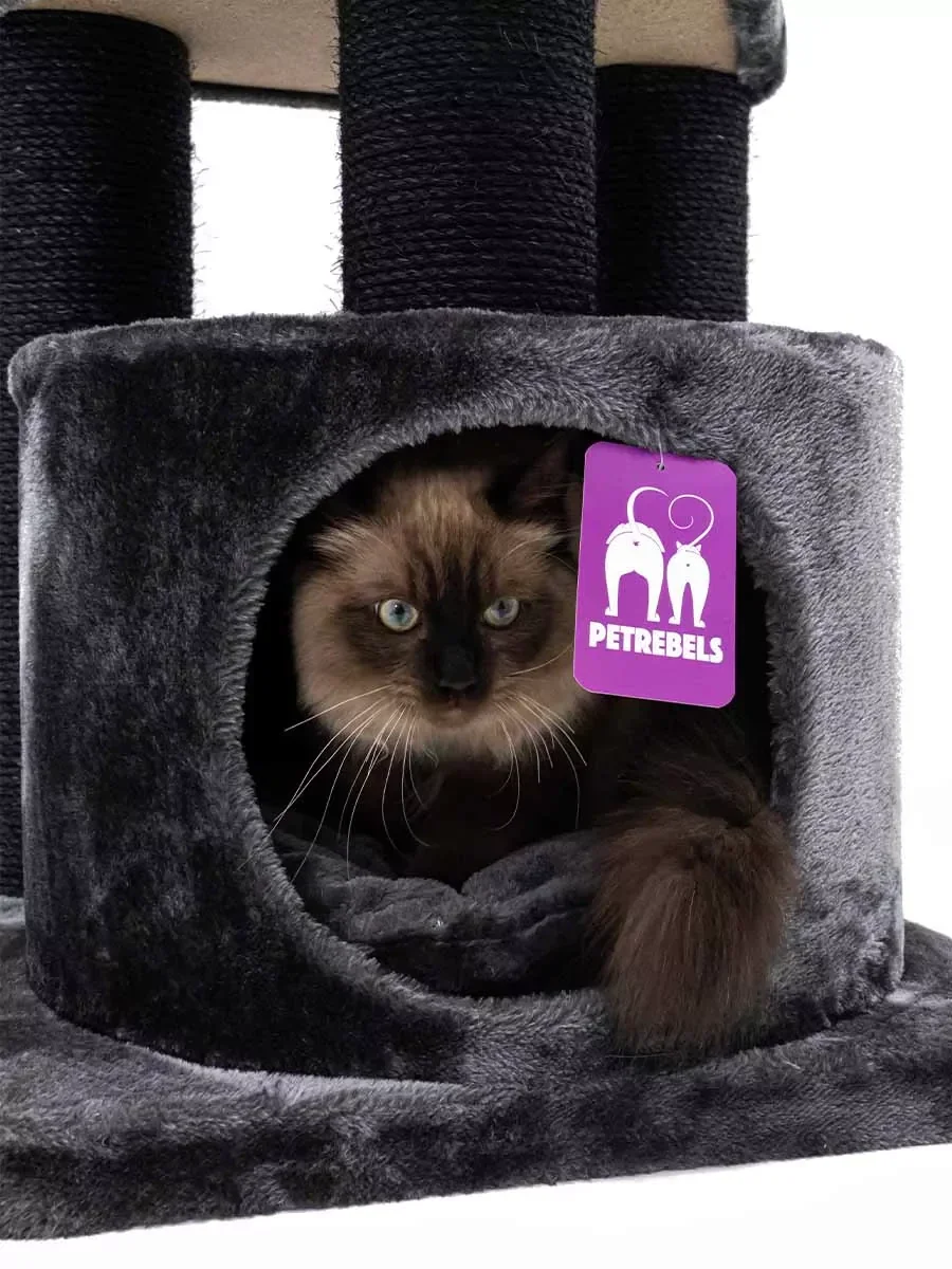 Ben je op zoek naar een luxe krabmeubel voor je kat, maar wil je er niet te veel ruimte aan kwijt? Stop dan maar met zoeken! Onze Victoria 125 heeft alles wat jij en jouw Rebel nodig hebben. Want met drie krabstammen van 12 centimeter dik, fluweelzachte pluche, twee loungemanden, een speeltunnel, een speeltje en een heerlijk slaaphuisje is dit prachtige krabmeubel compleet uitgerust om jouw katten te vermaken.