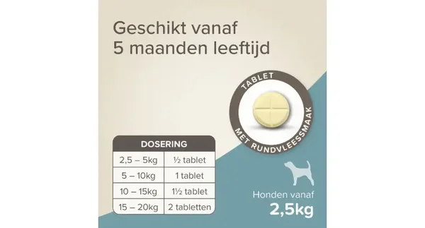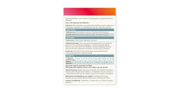 Wormtabletten All-in-one hond 2,5 - 20kg is voor de behandeling van gemengde infecties veroorzaakt door volwassen cestoden en nematoden van de volgende soorten: -Haakwormen: Ancylostoma caninum, Uncinaria stenocephala -Spoelwormen: Toxocara canis, Toxascaris leonina -Lintwormen: Taenia spp, Dipylidium caninum Geschikt vanaf 5 maanden leeftijd. • tegen spoelwormen, haakwormen en lintwormen • voor honden van 2,5 tot 20kg Werkzame stof: Praziquantel 50 mg, Pyrantel (als pyrantelembonaat) 50 mg en Febantel 150 mg.
