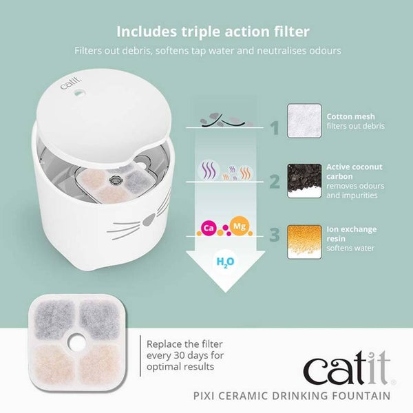 Gemaakt van dik, prachtig geglazuurd keramiek, biedt de Catit PIXI Ceramic Fountain katten een ergonomisch verhoogde bron van schoon water. Naast de tijdloze uitstraling is keramiek een hygiënisch, vaatwasmachinebestendig materiaal dat zacht is voor de gevoelige huid van de kat en helpt om symptomen van kinacne te verminderen.